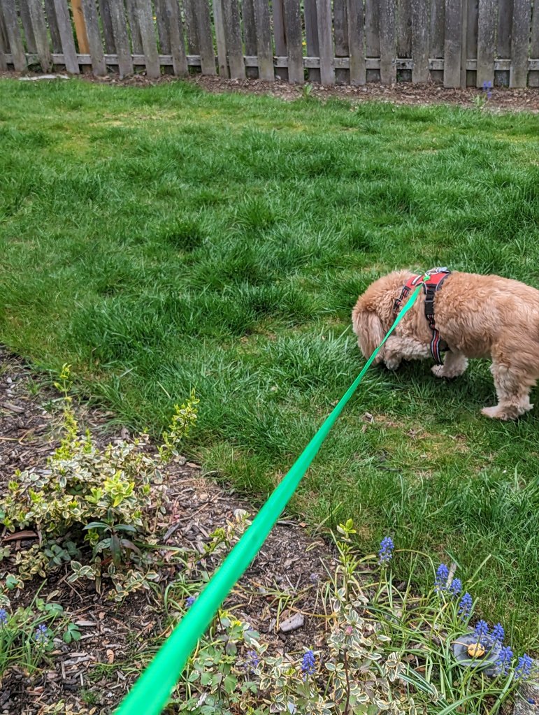 a leash hanging in the shadows pieces of grass you’d tracked in
